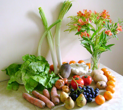Aha. Nach 3 Jahren Suche hab ich also endlich einen Verein gefunden, der mir Biokisten packt. Zugegeben, die Suche war manchmal etwas halbherzig beziehungsweise gar keine, aber trotzdem schwingt ein Endlich mit, wenn ich so drüber nachdenke. Toll, das Foto, ne? Die Weintrauben sind übrigens schon alle weg und auch der Salat wird kein Morgen erleben. Yea-heah. Aber natürlich bleibt die Frage, wie ist das möglich! Und woher komm die Blumen? Liebe Leute: der Verein heißt Adda! Was zugegeben ein echt häßlicher Name für ein so schönes Anliegen ist. Adda gibts seit ungefähr einem Jahr in Nantes und steht für Association pour le Développement Durable par l’Alimentation. (Was auch im Französischen irgendwie holpert.) Adda ist jedenfalls für alle und bio und hat neben Umweltschutz auch ein soziales Anliegen: die Hälfte des Ladens besteht nämlich aus einer Küche, wo zusammen diskutiert (Erderwärmung, erneuerbare Energien, Finanzkrise, was eben grad anliegt) oder gekocht wird. Bei solchen Treffen wird vielleicht auch erörtert, was man bitteschön aus so was kochen kann:Den Namen von dem hab ich vor Schreck gleich wieder vergessen, aber es soll aus der Familie von Zucchini & Co kommen und gekocht leicht nussig schmecken. Hm, ma sehn. Wie dieses Gewächs kommt alles Obst und Gemüse aus der Biokiste natürlich von lokalen Partnern aus Nantes und Umgebung. Achja, und die Blumen? Die hab ich so dazubekomm. Nett, ne?